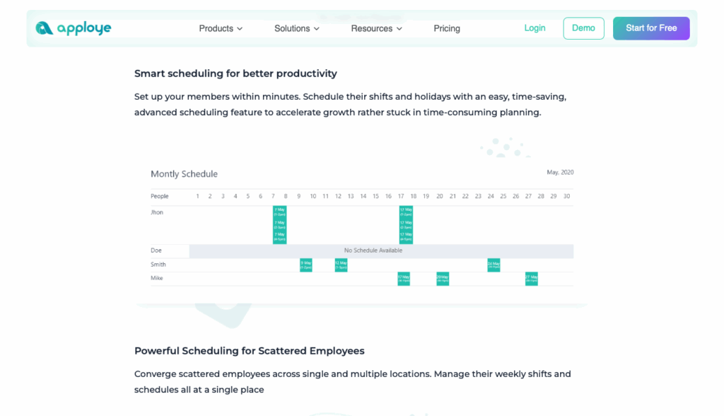 To make sure that I didn’t overlook anything, I reached out to Apploye via the chat on their website. I told the live chat agent that I couldn’t find scheduling in the app, and she told me that “We don’t have one sorry.” When I sent her Apploye’s webpage on scheduling, she explained, “Its on our roadmap.”